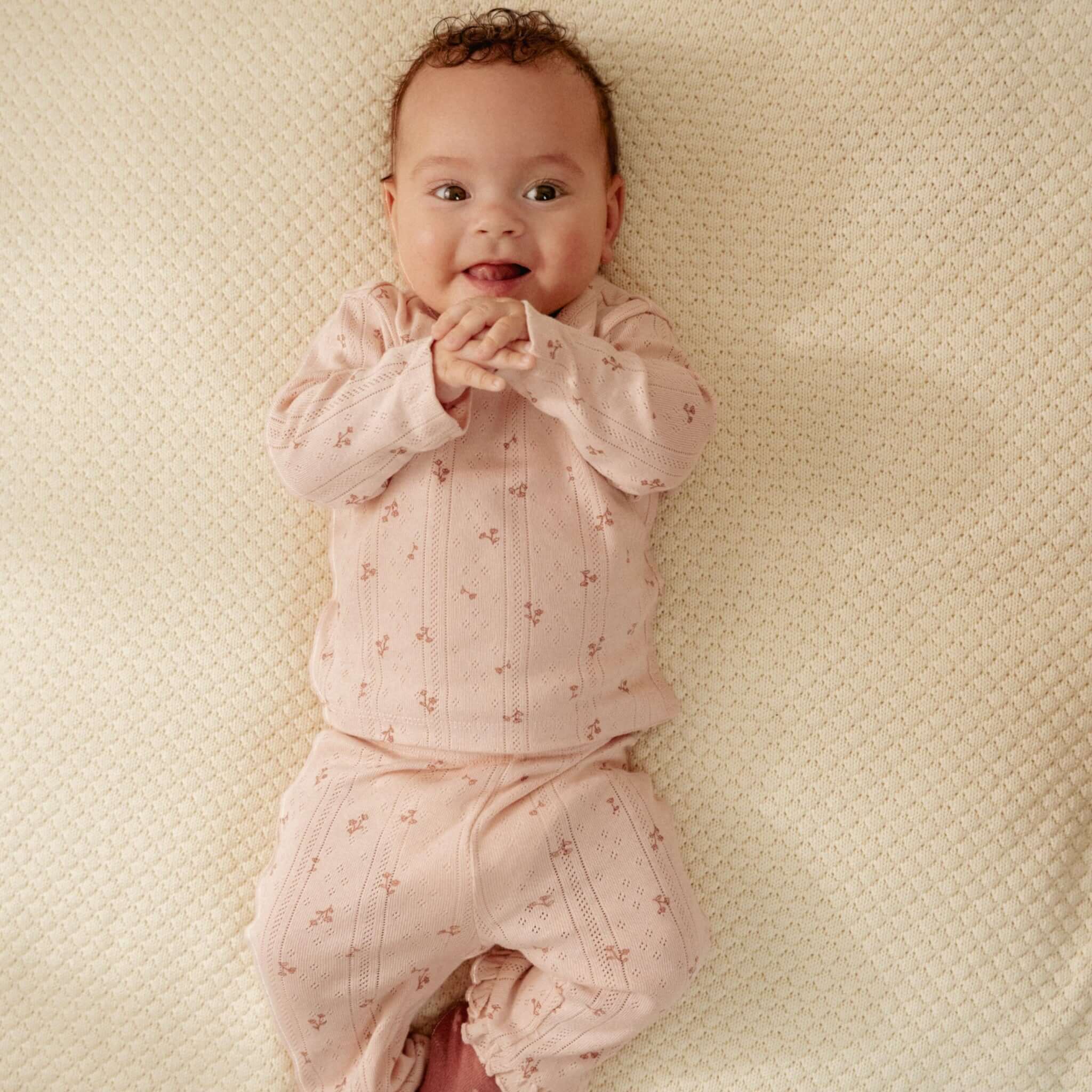 Το μαλακό οργανικό βαμβάκι με την εκλεπτυσμένη pointelle υφή σε απαλό ροζ χρώμα είναι διακοσμημένο με ένα χαριτωμένο σχέδιο λουλουδιών.