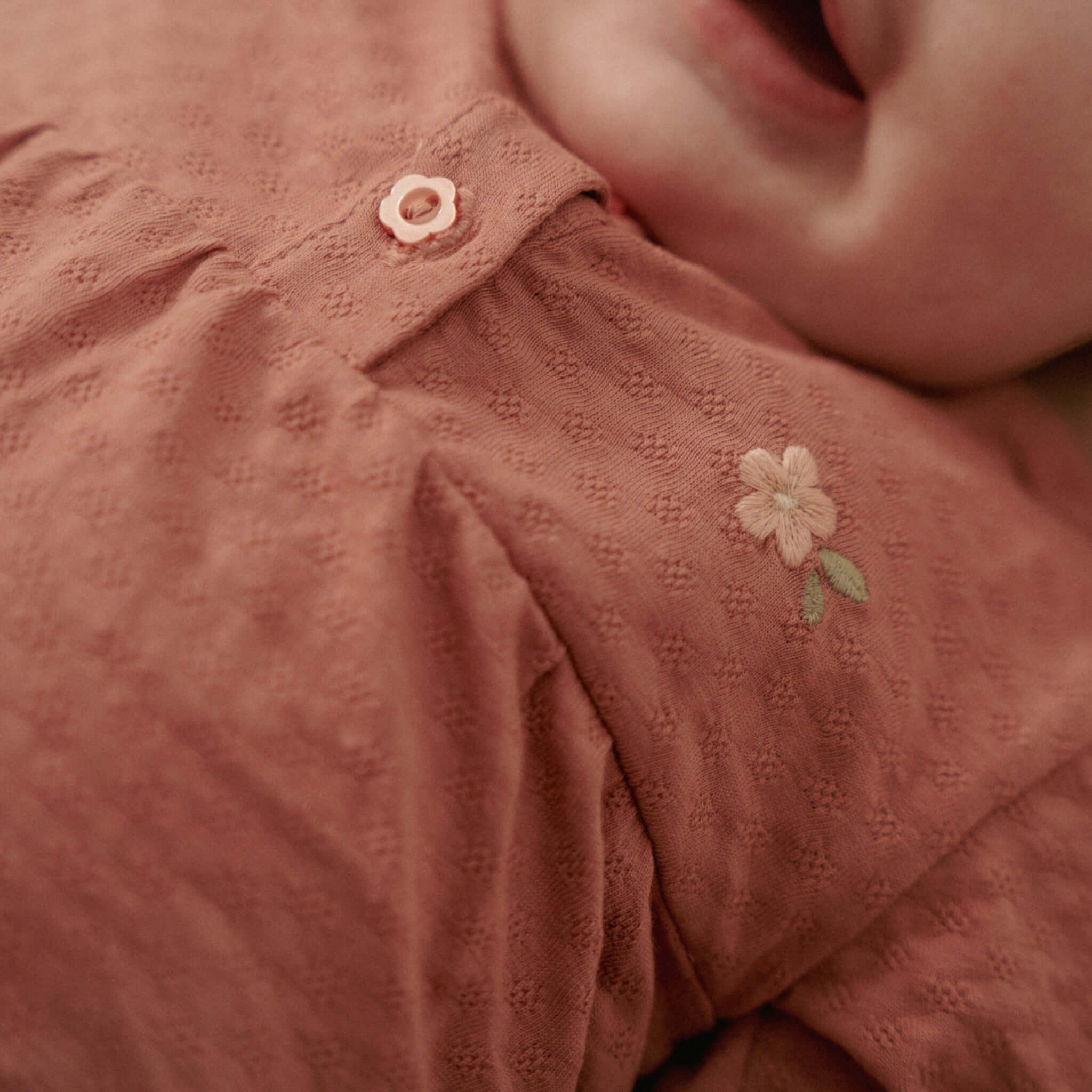 Τα ελαστικά τελειώματα στα μανίκια διαθέτουν χαριτωμένα βολάν, προσθέτοντας μια ονειρική, παιχνιδιάρικη πινελιά. Τα μικροσκοπικά κουμπάκια σε σχήμα λουλουδιού κάνουν το ντύσιμο εύκολο και το μικρό σας ακόμη πιο χαριτωμένο. Το διακριτικό κέντημα στο στήθος ολοκληρώνει τη μαγευτική εμφάνιση.