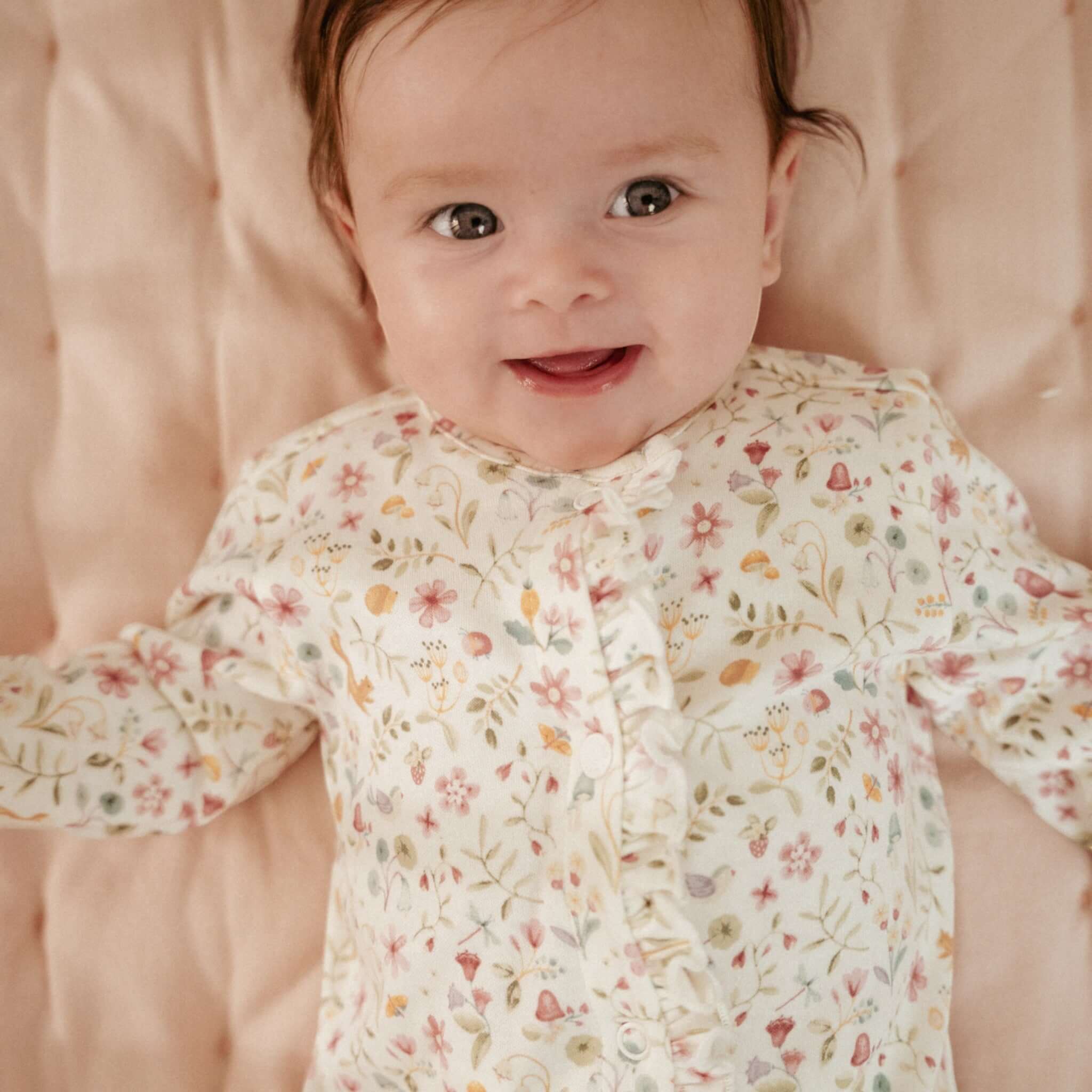 Αυτό το υπέροχο ολόσωμο φορμάκι είναι διακοσμημένο με χαριτωμένα λουλούδια και αξιαγάπητα ζωάκια, όπως παιχνιδιάρικους σκίουρους και γλυκά πουλάκια, ενώ οι λεπτομέρειες στο κλείσιμο προσθέτουν μια τρυφερή πινελιά.