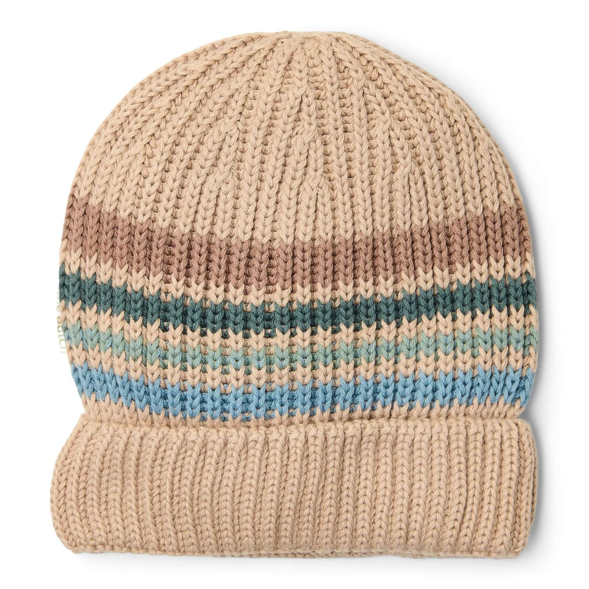 Κατασκευασμένο από απαλό οργανικό βαμβάκι, αγκαλιάζει γλυκά το κεφαλάκι του και κρατά τα αυτάκια του ζεστά. Οι πολύχρωμες ρίγες του προσθέτουν μια παιχνιδιάρικη διάθεση και το κάνουν εύκολο να συνδυαστεί με όλα τα ρούχα της συλλογής.