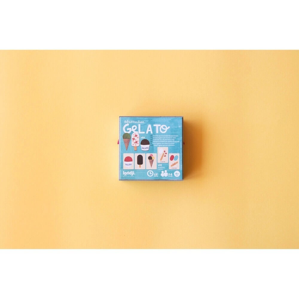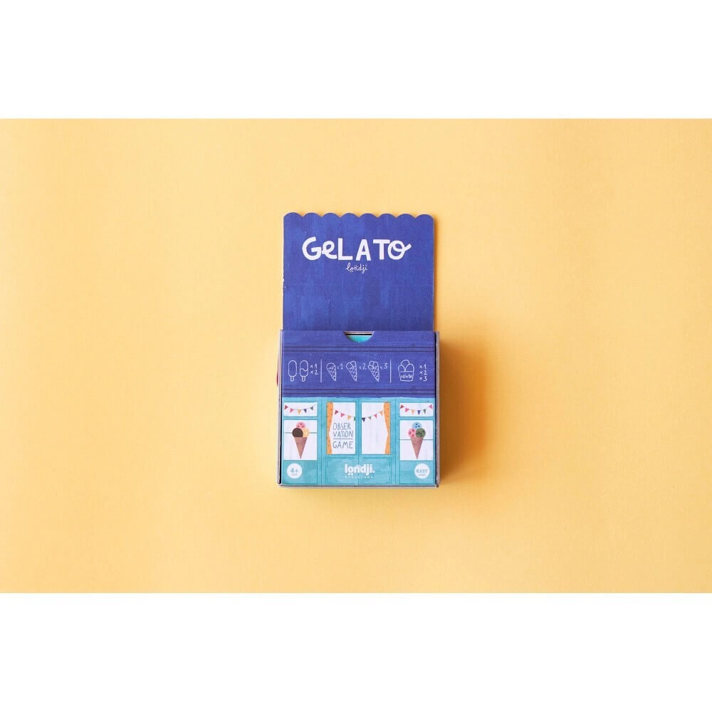 Στο πιο διασκεδαστικό παγωτατζίδικο της πόλης, οι μπάλες παγωτού εξαφανίζονται με αστραπιαία ταχύτητα! Θα προλάβετε να πάρετε την σωστή πριν από όλους; Το «Gelato» είναι ένα γρήγορο και ανατρεπτικό παιχνίδι παρατήρησης: συνδυάστε το κομμάτι με την κάρτα και κερδίστε τη γλυκιά νίκη! Μια συναρπαστική πρόκληση για τους πιο γρήγορους και παρατηρητικούς!