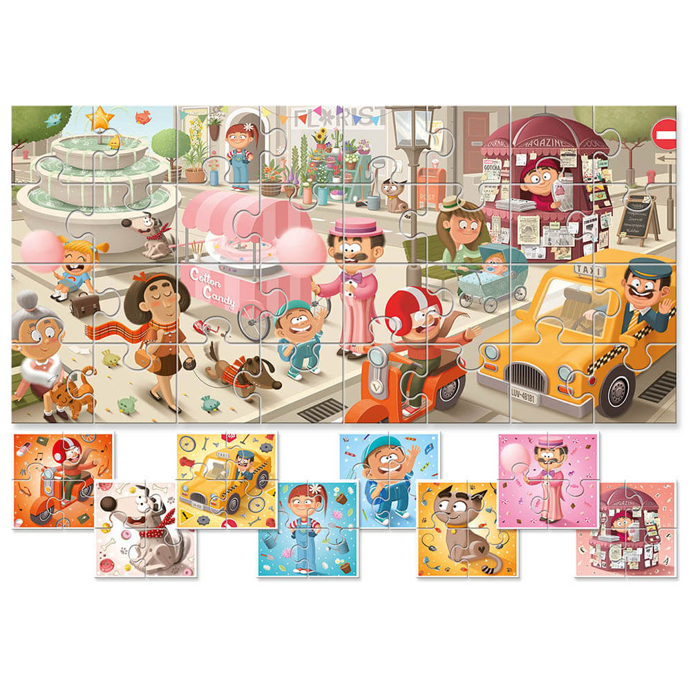 Ένα πρωτότυπο παζλ με 32 κομμάτια διπλής όψεως για τους μικρούς μας φίλους! Από την μία πλευρά, το παιδί συνθέτει 8 παζλ με χαρακτήρες της πόλης των 4 κομματιών και από την άλλη πλευρά, όλα μαζί τα κομμάτια μπορούν να συνθέσουν μια μεγάλη εικόνα ‘Η Πόλη’ μαθαίνοντας στο παιδί το περιβάλλον στο οποίο ζουν οι χαρακτήρες. Έτσι το παιδί μπορεί να ξεκινήσει με τα μικρότερα παζλάκια και σταδιακά να μεταβεί στην ολοκλήρωση του μεγαλύτερου, αναπτύσσοντας τη συγκέντρωση, την παρατηρητικότητα και τη λογική!